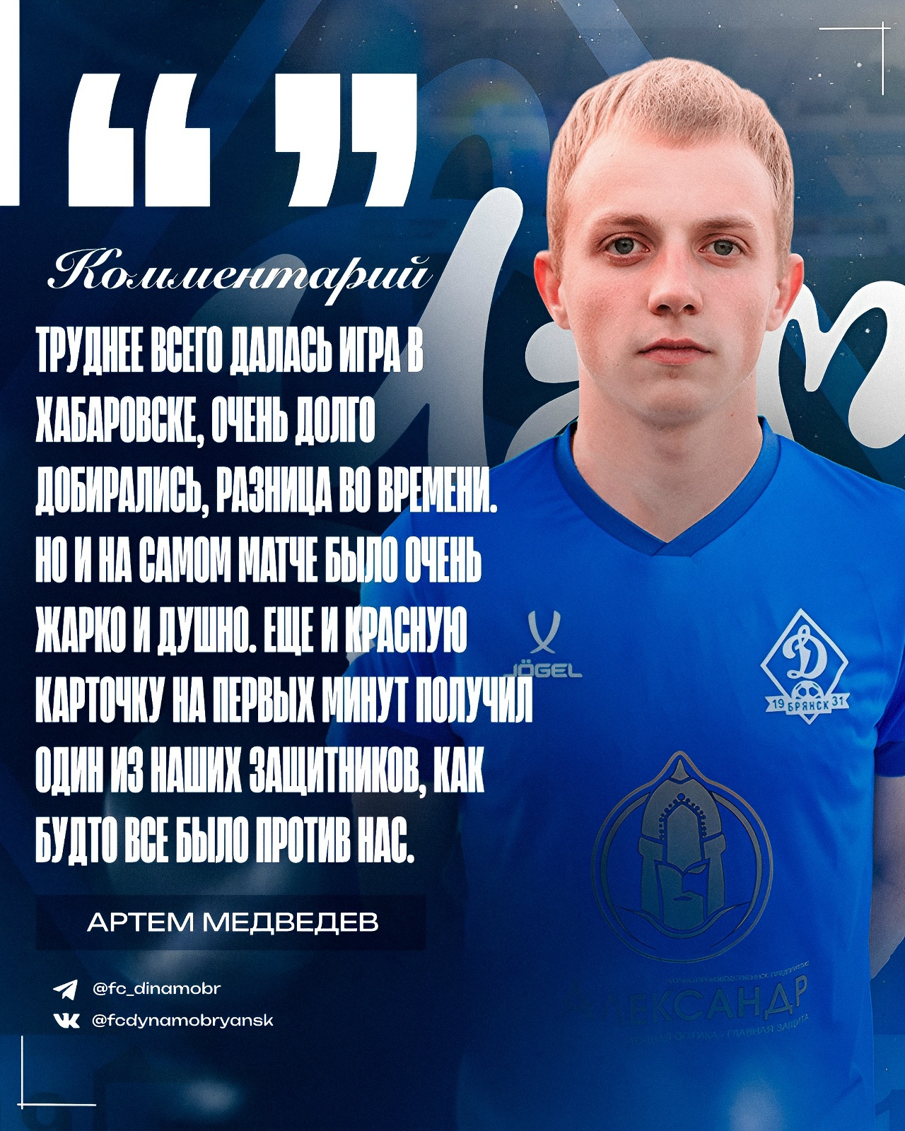 Я рад, что вернулся в родную команду. Со многими ребятами я уже играл в предыдущих сезонах, так что проблем с акклиматизацией в коллективе вообще не было. Мне просто очень хотелось помочь родной команде стать чемпионами. У меня сейчас имеется действующий контракт с «Динамо-Брянск», поэтому на данный момент я - остаюсь игроком этой команды и сделаю всё возможное, чтобы продолжить побеждать в следующем году!»