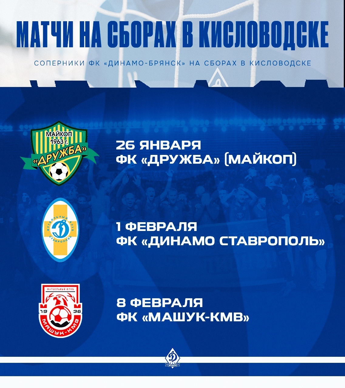 Стали известны соперники «Динамо-Брянск» в контрольных матчах на сборах в Кисловодске. 26 января наша команда сыграет против «Дружбы» из Майкопа, 1 февраля - поединок с ФК «Динамо Ставрополь», а 8 февраля динамовцы встретятся с ФК «Машук-КМВ» из Пятигорска.