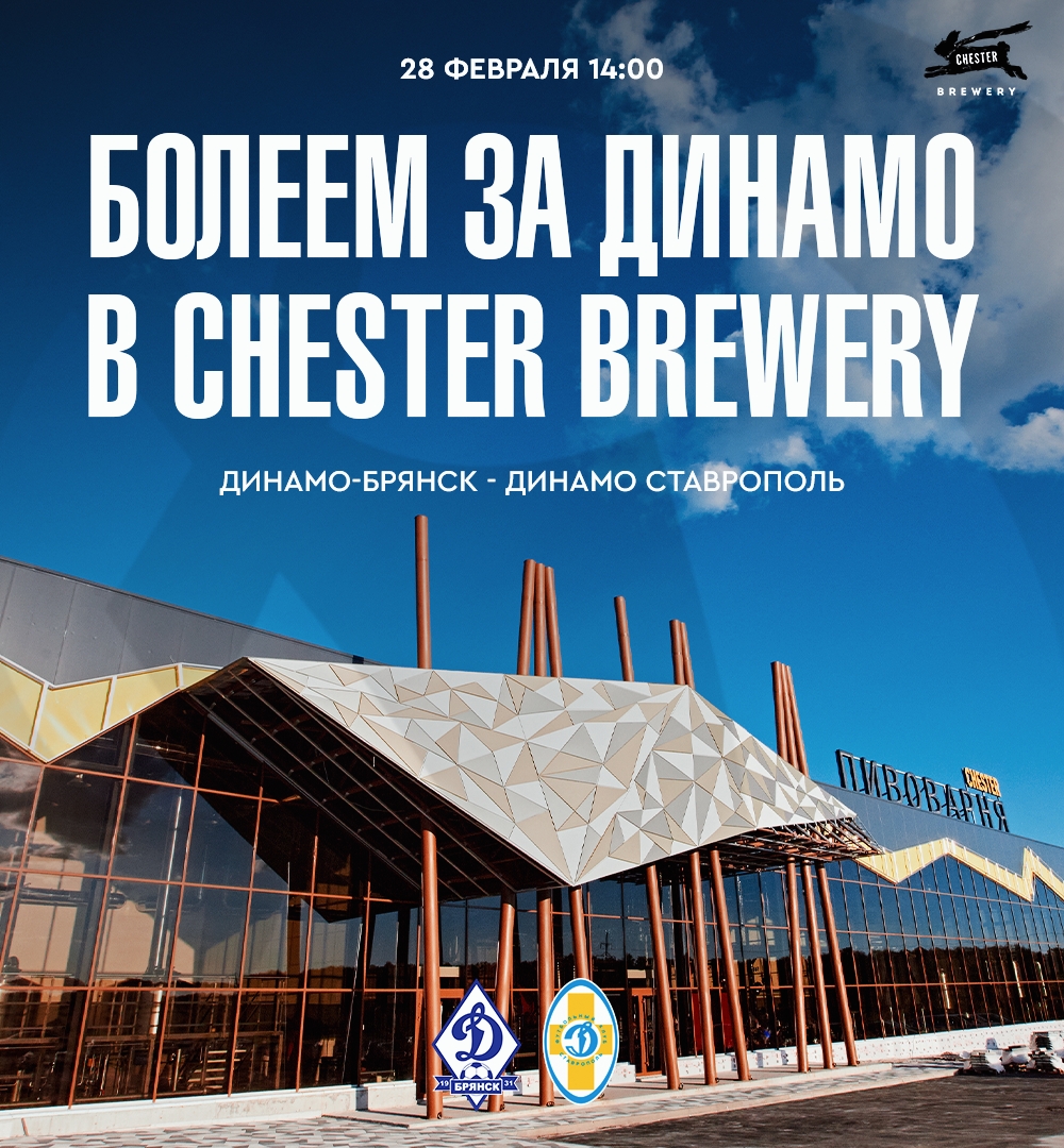 Динамовцы, уже в эту субботу, 28-го февраля мы объявляем общий сбор в гостях у наших друзей из пивоварни «Chester Brewery». На больших ТВ-экранах ресторана будет показана прямая трансляция первого матча нашей команды в новом сезоне Первенства Второй лиги А.